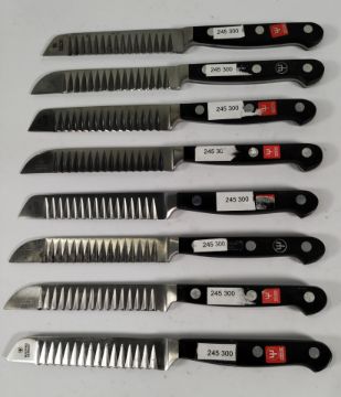 Seven Wusthof fluted decorating bolstered knives 110mm (4200) (over 18s only).