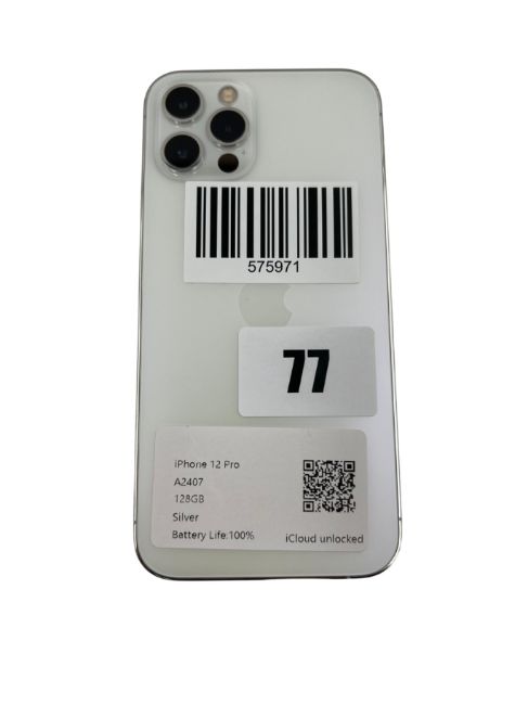 Pre-owned Apple iPhone 12 Pro A2407 128GB in Silver (iCloud unlocked. Battery health: 100%) (Checkmend report available on request).