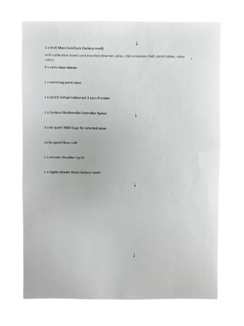Pre-owned VIVE Mars CamTrack (Factory Reset) with Calibration Boards, Valve Base Stations, Vanishing Point Viper, LOLED Indiemark 3 Lens Encoder, Stream Deck, Contour Controller, be quiet! Base Unit & HDD Cages, Neewer Shoulder Rig.