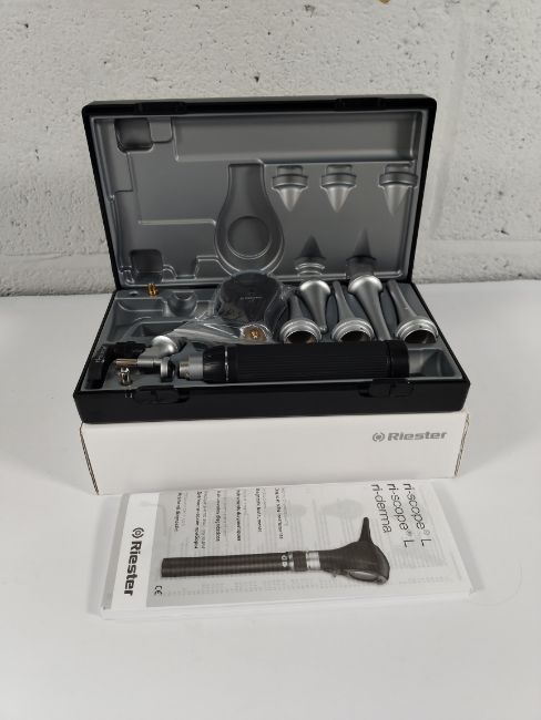 An as new Riester 3.5v xenon otoscope with C-handle, comes with two lithium batteries (REF: 3860).