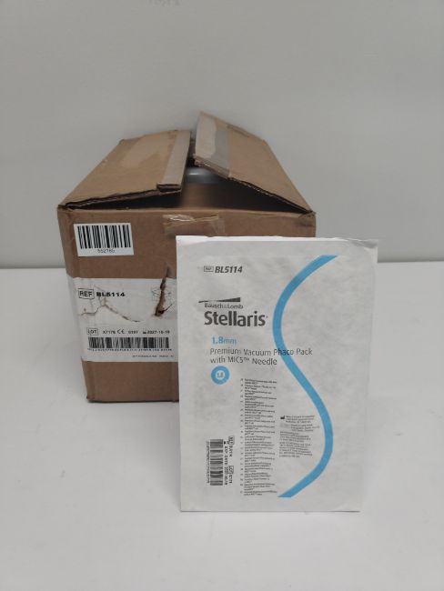 A box of six as new Bausch & Lomb Stellaris Premium Vacuum Phaco Pack with MICS Needle, 1.8mm (REF: BL5114, EXP: 2027-10-19).