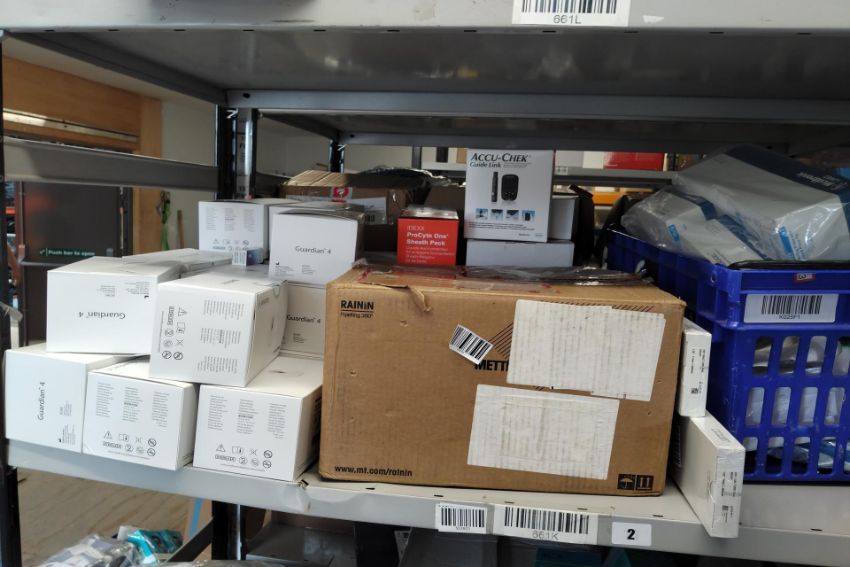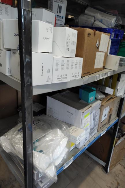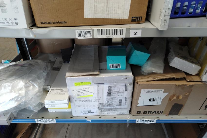 Two shelves of expired medical products and equipment. (Please note: these items have past their expiration date and should not be intended for human use).
