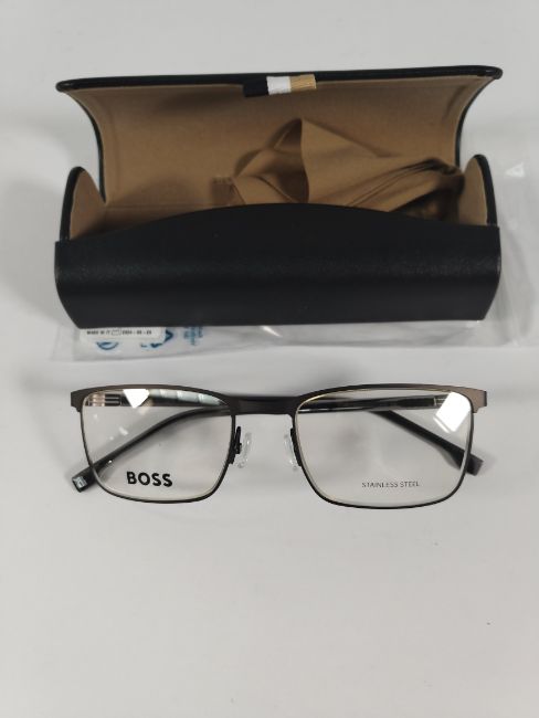 As new Boss 1637 rectangle glasses frames (56-19-150), black, with case.