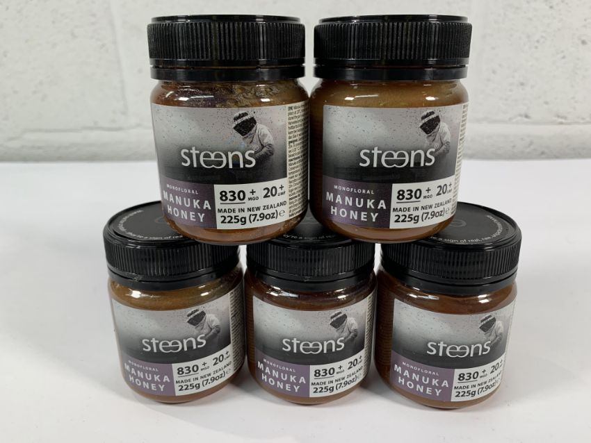 Five as new Steens Monofloral Manuka honeys 225g sealed jars, 830+MGO, 20+UMF (Exp 25/29).