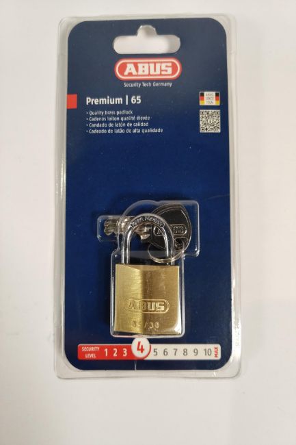 Two boxes (twelve units) of as new Abus 65/30 padlocks, security level 4, hardened steel shackle, high protection against manipulation, boxed (B/EFSPP).