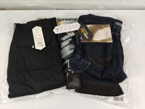 Two Dassy Liverpool work trousers, black, UK 35 and one Dassy Kyoto stretch work jeans, blue denim, UK 32, all as new.