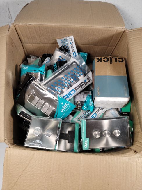 A large quantity of Click Plug covers, light switches and related to include brushed stainless steel click definity 4g dimmer/speed SW plate, Click definity 115v/230v dual voltage shave socket and other related items (approximately 125 items).