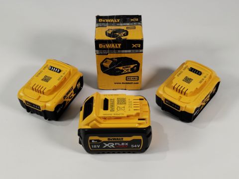 Four DeWalt Lithium Ion Rechargeable Batteries, 2x DCB184 - 18V XR 5Ah, 1x DCB546 - 18V/54V XR FlexVolt 6Ah, 1x DCB182 - 18V XR 4Ah.