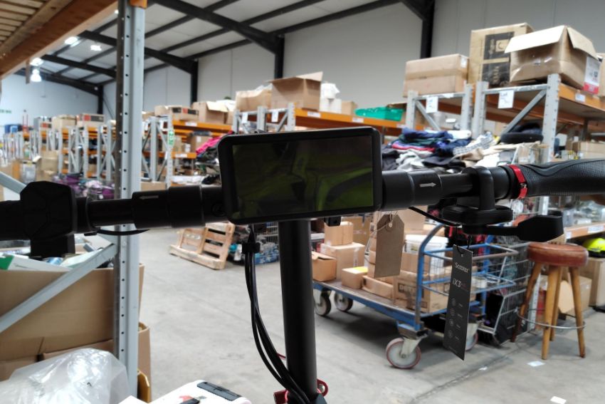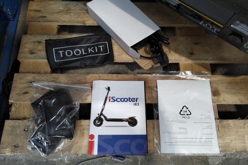 An iScooter iX3 800W off road electric scooter with box and tag, manual and charger in red and black.