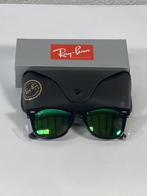 A pair of Ray-Bans Wayfarer Flash sunglasses in black with green mirror lenses (RB2140 901-19).