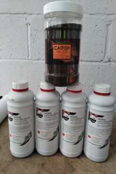 Four Dyofix lake and pond colours - pond blue liquid water treatment bottles and one jar of catfish pellets 850g.