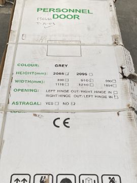 An as new steel security door with multi-point locking system in grey (height 2065mm, width 910mm, left hinge in opening, no astragal, with lock).