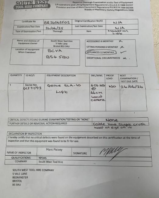 A pre-owned Genie SLA-15 Superlift Advantage lifter with recent and in date L.O.L.O.E.R certificate.