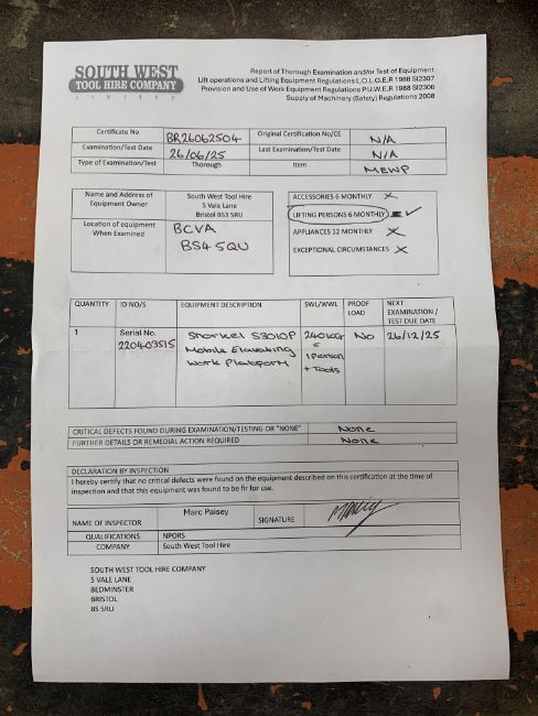 A pre-owned Snorkel (S3010P) mobile operating platform with recent and in date L.O.L.O.E.R certificate.