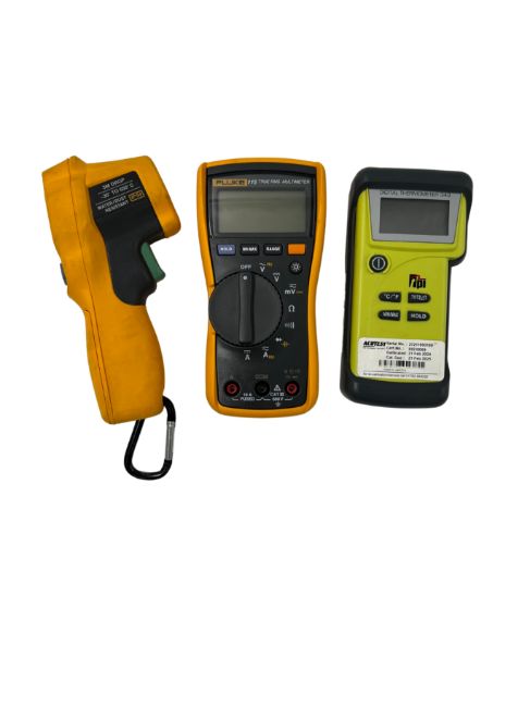 Pre-owned Fluke 115 True RMS Digital Multimeter, Fluke 62 MAX PLUS Infrared Thermometer (Last Cal 02/2024) & a TPI 343 Digital Thermometer (Last Cal 02/2024).