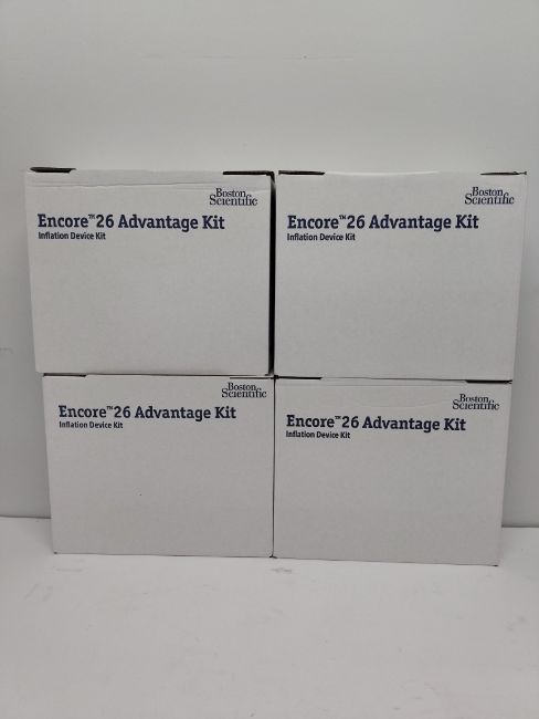 Four as new boxes of Boston Scientific Encore 26 Advantage Kit, Inflation Device Kit, 5 per box (REF: H749(0452705)2, EXP: 2026-12-29).