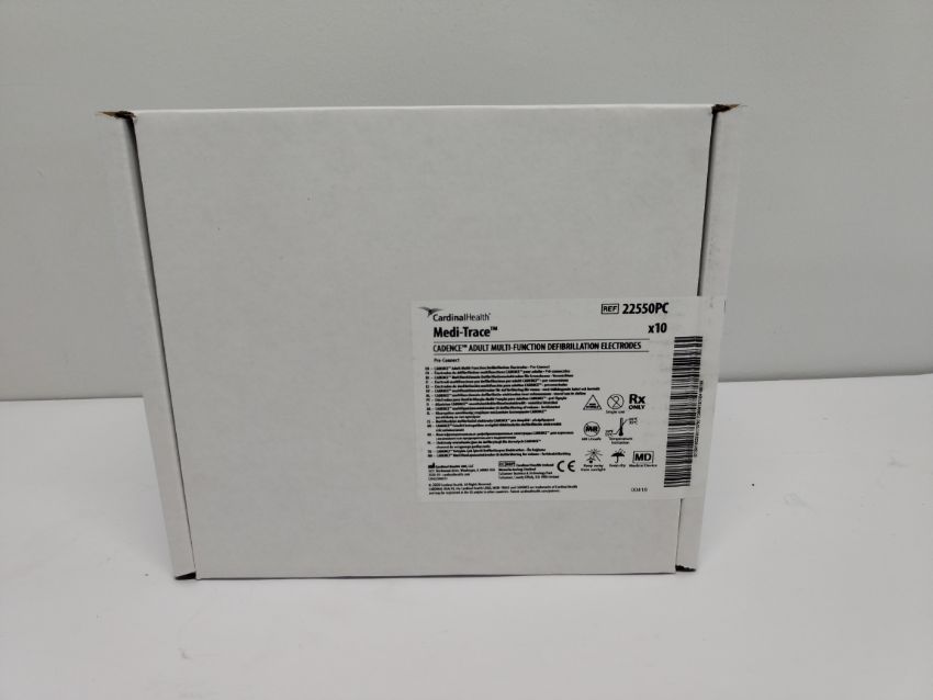 A box of as new Cardinal Health Medi-Trace Cadence adult multi-function defibrillation electrodes (REF: 22550PC, EXP: 2026-06-13).