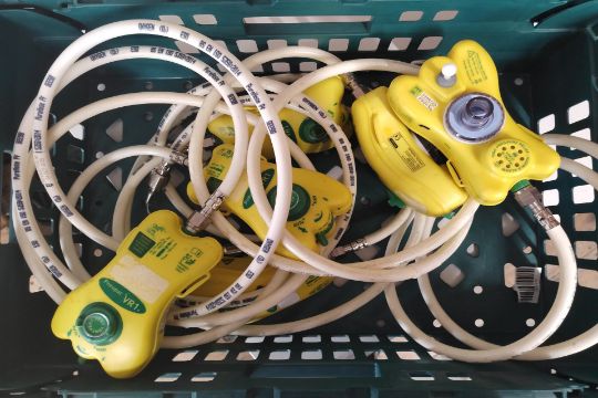 Six pre-owned Smiths Medical Pneupac VR1 Portable Mechanical Ventilator with Hose (REF: 520A1125).