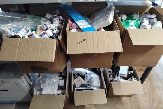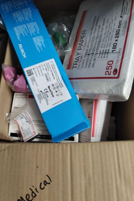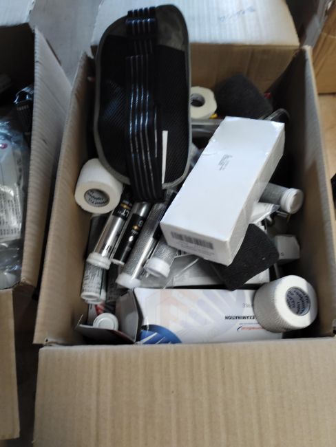 Six boxes of assorted medical products (mainly includes in-date items but may have some out-of-date items).