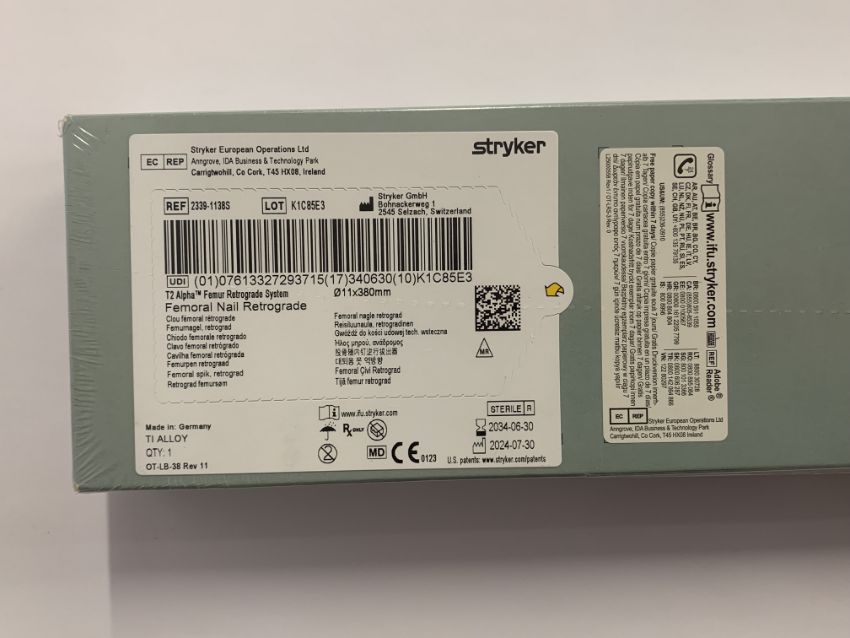 An as new Stryker T2 Alpha Femur Retrograde System Femoral Nail, diameter: 11m, length: 380mm (REF: 2339-1138S, EXP: 2034/06/30).