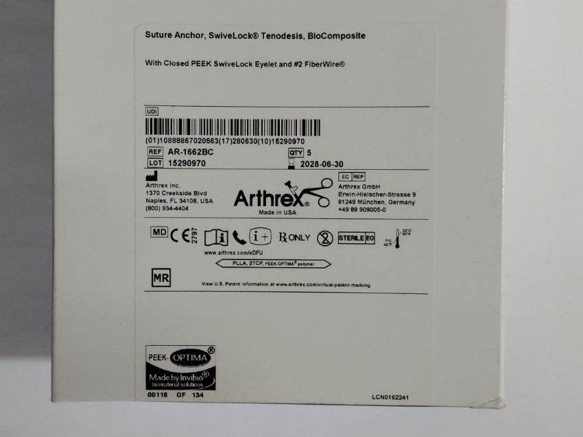 A box of five as new Suture Anchors, Swivelock Tendoesis BioCompostie (REF: AR-1662BC, EXP: 2028/06/30).