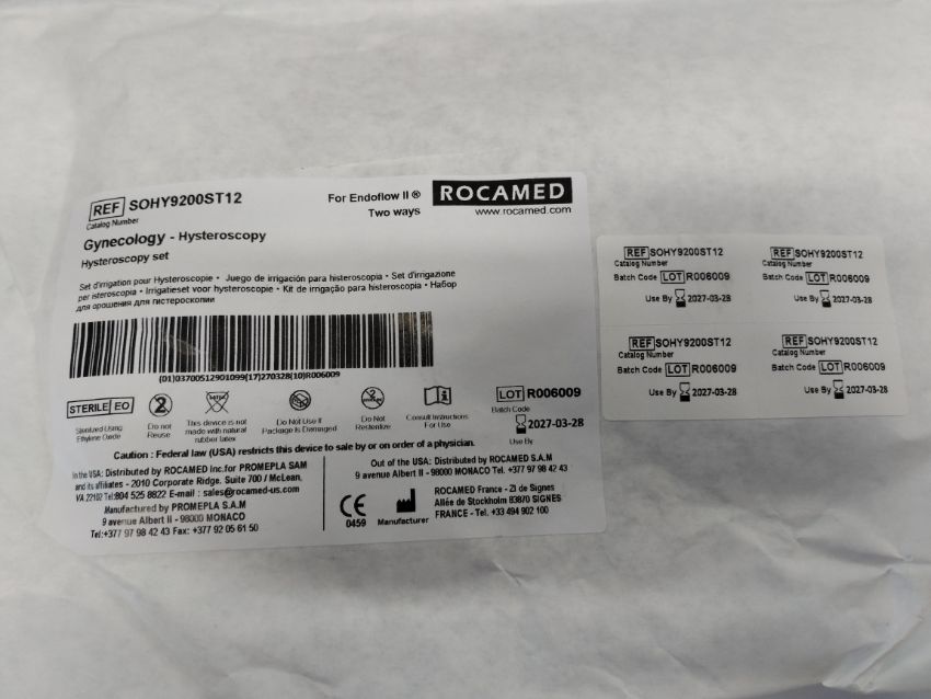 Two boxes of as new Rocamed Gynecology Hysteroscopy irrigation/suction sets for Endoflow II two ways (15 per box, REF: SOHY9200ST12, EXP: 2026-03-28).
