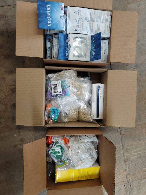 A large quantity of assorted dental, oral hygiene and other related products on two shelves.
