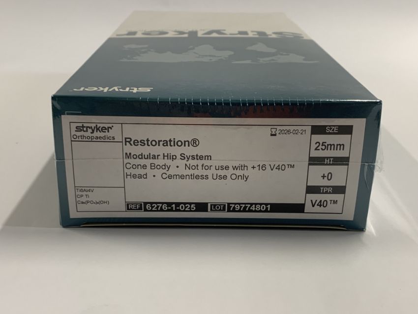 As new Stryker Orthopaedics Restoration Modular Hip System (REF: 6276-1-025) Size: 25mm, HT: +0, TRP: V40 (EXP: 2026/02/21).
