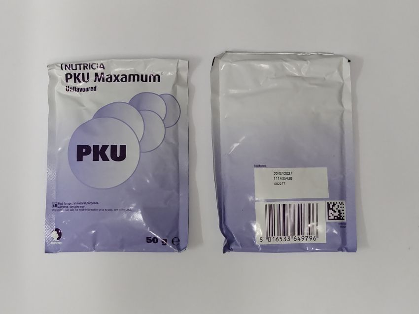 A box of Nutrica PKU Maxamum Unflavoured Powder Sachets (30 packs x 50g) (BC: 5016533649802, EXP: 2027/07/22).
