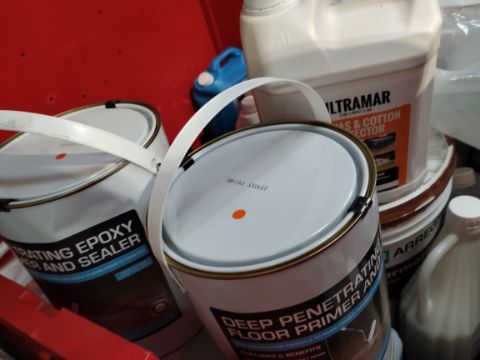 A stillage of assorted liquids and related items to include floor sealer, canvas & cotton protector and decking stain. and engine coolant (stillage not included).