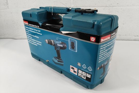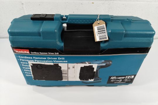A as new Makita 18v cordless combi drill kit, 2x 2Ah Li-Ion batteries & 74 piece accessory Set (clip missing on hardcase) (HP488DAEX1) (Stock image)