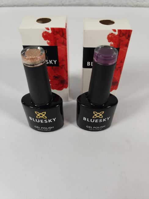 Twenty four Bluesky Gel Nail Polish (10ml), Plum Shine A003 (x12) and Rose Gold QCG15 (x12).