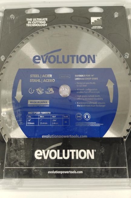 Three as new Evolution M355TCT-66CS Steel Cutting Blades 355mm x 25.4mm x 66T, Ultra High Grade Carbide Teeth (packaging slightly damaged).