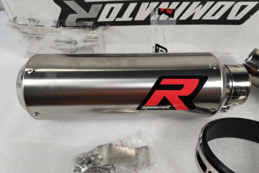 A Dominator short motorcycle exhaust can - fitment: Suzuki DL1050 VStorm (2020-2021) with bracket, boxed.