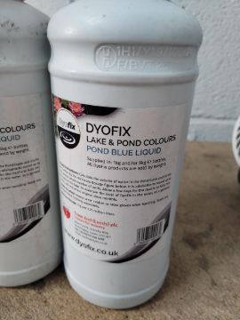 Four Dyofix lake and pond colours - pond blue liquid water treatment bottles.
