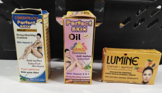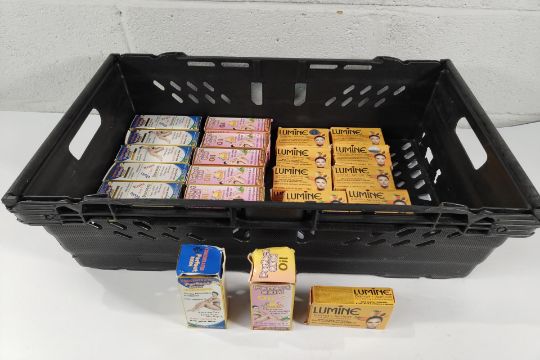 Twenty one beauty related products - nine Lumine carrot and apricot soaps 135g, six Perfect Skin strong bleaching treatments, six Perfect Skin oils 3-in-one strong bleaching treatments. Labels have signs of distress.