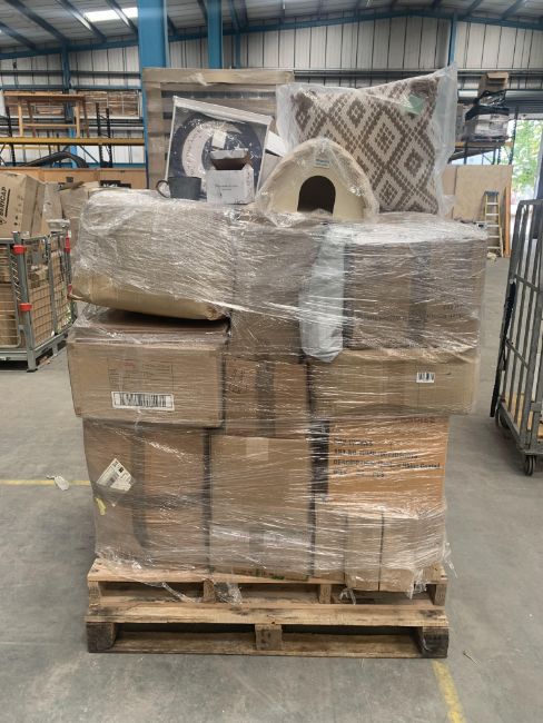 A pallet of assorted homewares to include hedgehog house, clocks, cups, cushions and related.