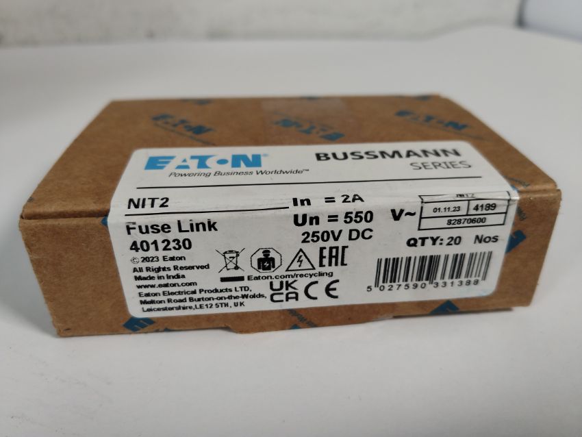 Twenty packs of as new Eaton Bussmann NIT2 fuse link 2 amp 550V (20 per pack, REF: 401230).