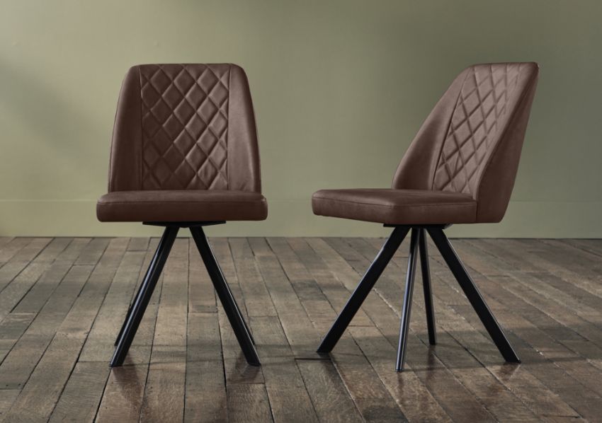 Two x Faux Leather Swivel Dining Chairs in Tan. RRP £400. 49W x 60D x 87H cm. Transform your dining room with a set of six stylish swivel-base dining chairs. Beautifully upholstered in faux leather. These ultra-comfy dining chairs even have swivel bases. Soft faux leather upholstery in a choice of colours. Slender black metal legs. See Product on Official Website