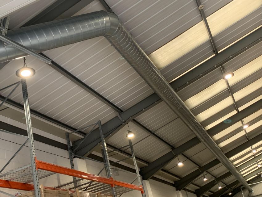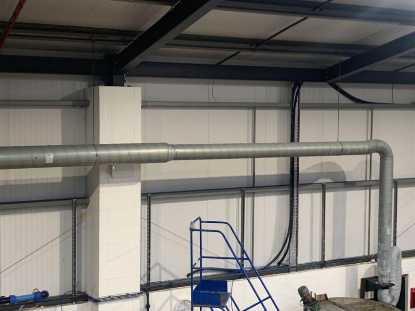 A centrifugal extraction fan can be found left of the front shutters of the warehouse. Air ducts run from the front of the main warehouse, through to the storage room and connects up to most of the machinery.