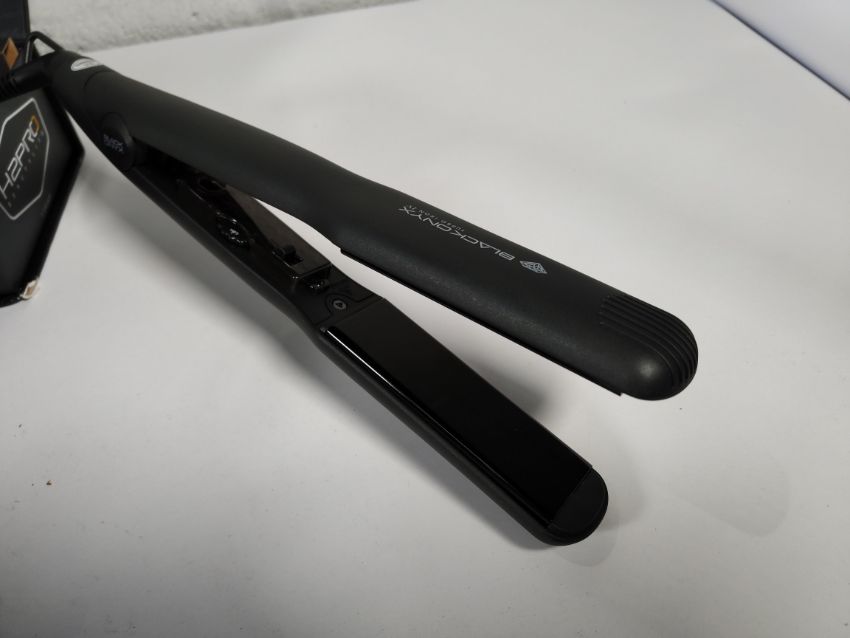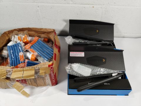 A H2PRO Black Diamond Mikro 1" Titanium Flat Iron and a Black Onyx 1 1/4" Flat Iron along with products and accessories.