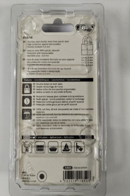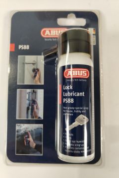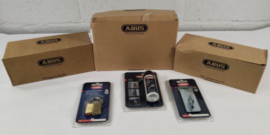 Three boxed (18 units) as new Abus related items - six 50ml lock lubricants (PS88), six 200/95 security level 2 hasps and six premium marine locks 65IB40 security level 5 (B/EFSPP) boxed.