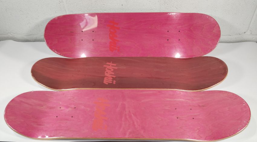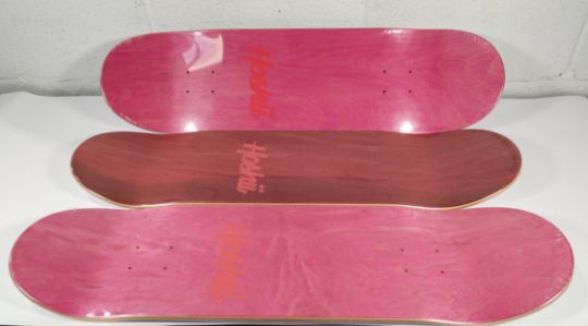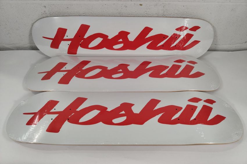 Three as new Hoshii "To Want" 32" x 9” Skateboard Decks - White and Red underside with Hoshii logo, sealed.