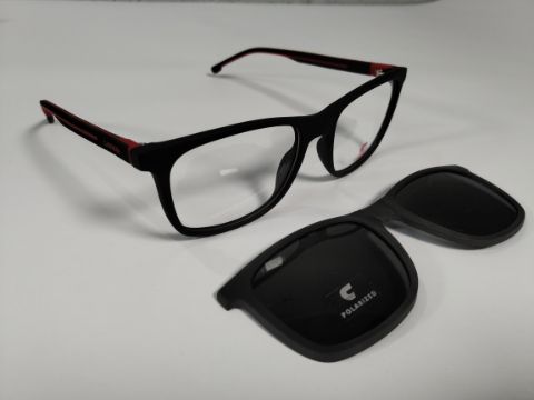 Eleven Carrera related items: seven pairs of glasses (various models and lenses), two polarized magnetic lens attachments and two pouches.