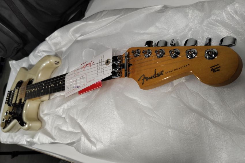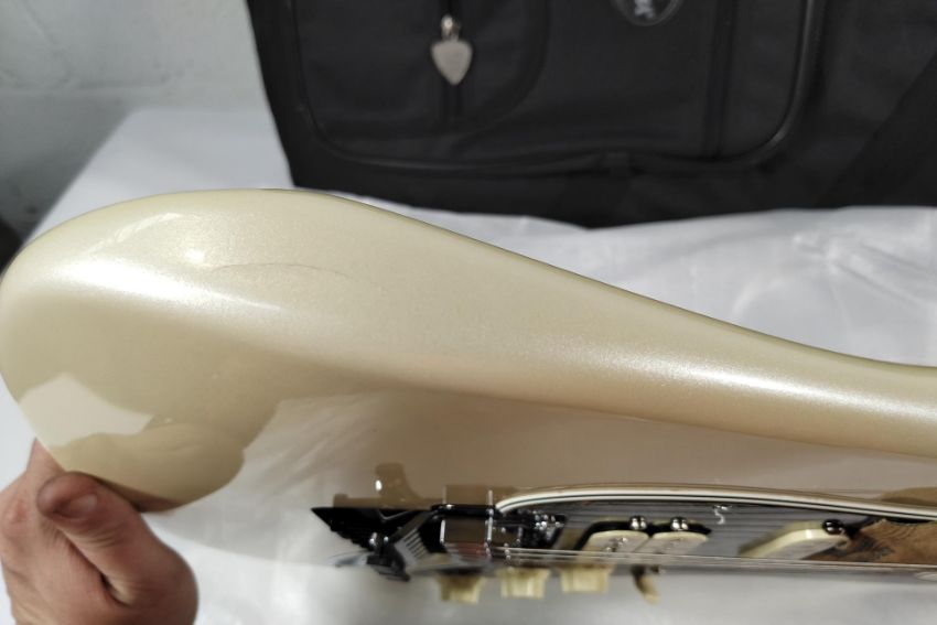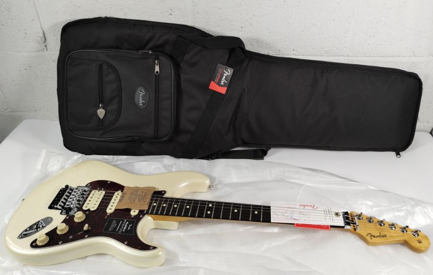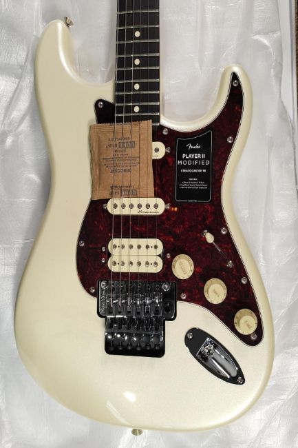 A Fender Player II Modified Stratocaster Floyd Rose in Olympic Pearl with gig carry case (some slight damage to top edge, a small mark on bottom edge and some under paint discolouration marks) boxed.