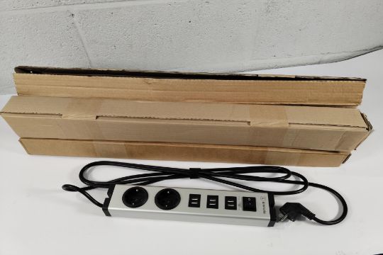 Four Ehmann type F 2+6 (PLUG/USB) gang power distribution units, 3m cable, 16A, 230 V (UK adaptor required).