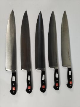 Five Wusthof French Cooks heavy bolstered knives 320mm, may have slight marks from long term storage (4582) (over 18s only) (tray not included).