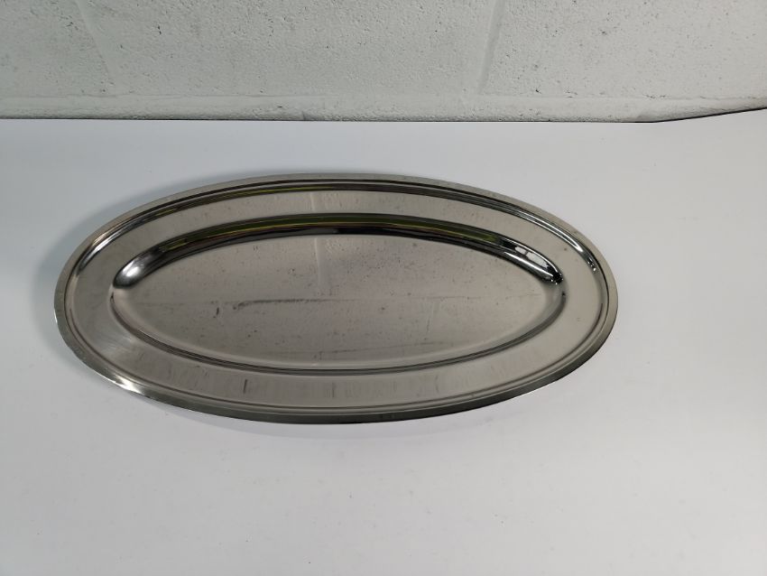 Fourteen as new stainless steel oval dishes, fish, double rim, narrow - 610mm (may show signs of long term storage).