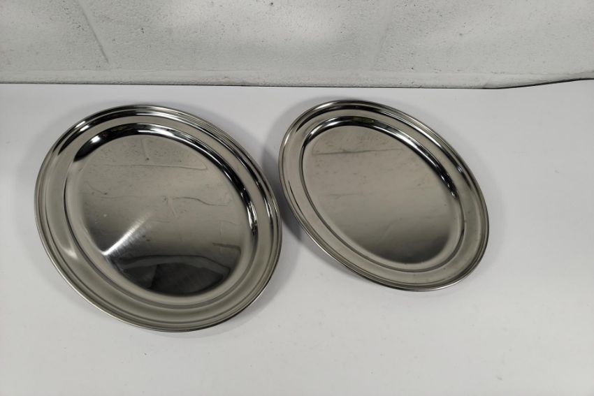 Eighteen as new stainless steel oval dishes, flat - 406mm (x6) and 457mm (x 12) (may show signs of long term storage).