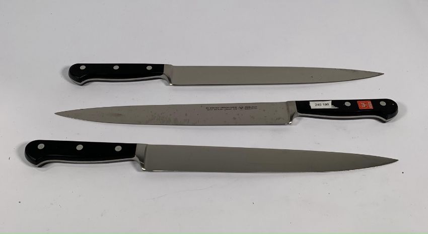 Three ED. Wusthof Dreizack Werk Tranchelard long slicer bolstered 260mm knives (4522) (over 18's only).